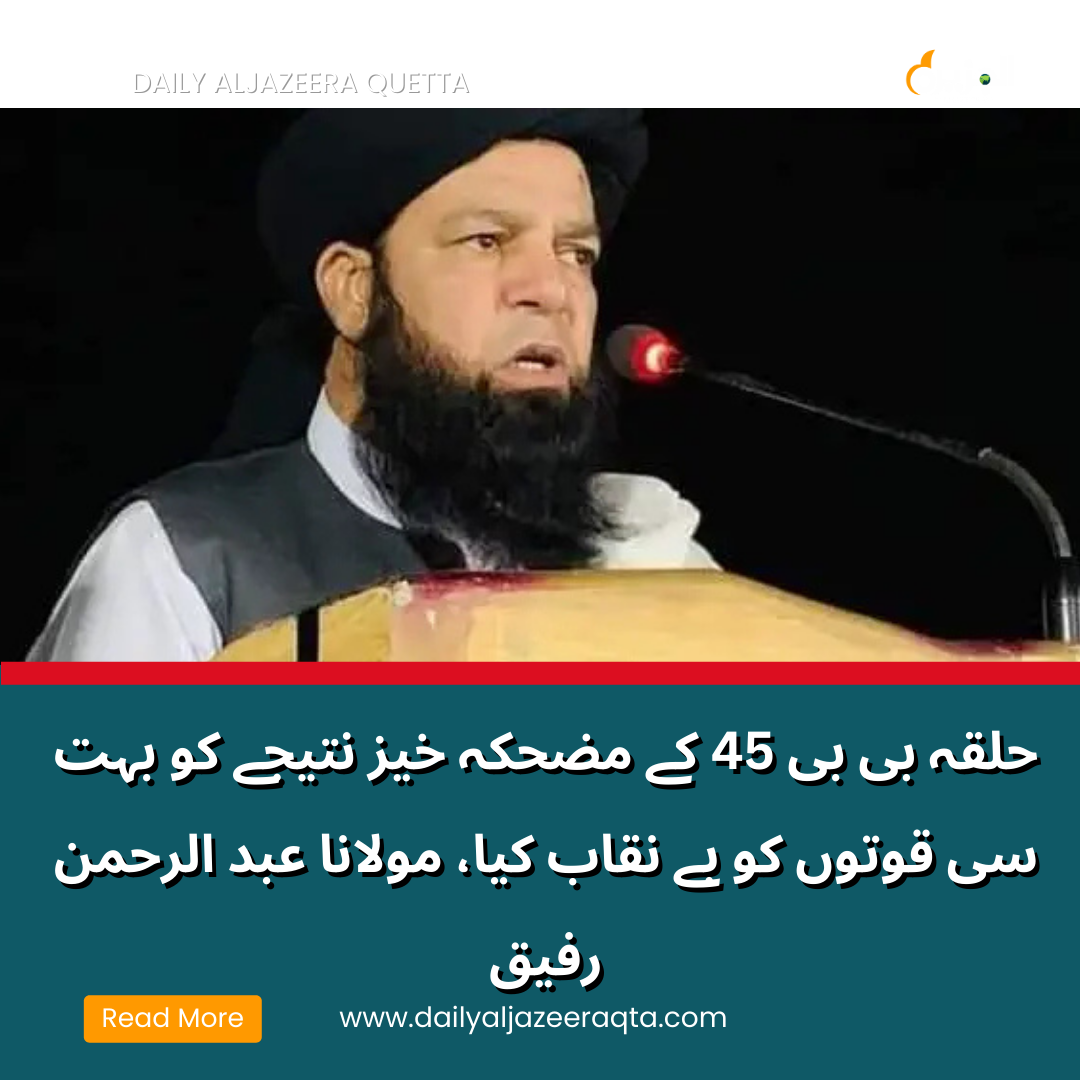 حلقہ بی بی 45 کے مضحکہ خیز نتیجے کو بہت سی قوتوں کو بے نقاب کیا،جمعیت علماء اسلام ضلع کوئٹہ کے امیر مولانا عبد الرحمن رفیق