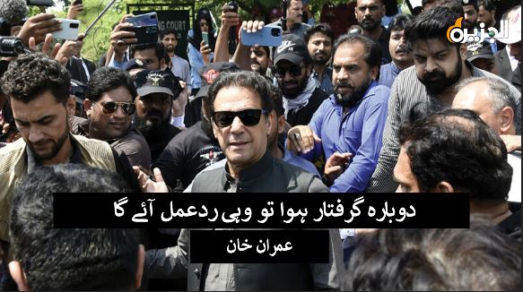 اسلام آباد چیئرمین پی ٹی آئی عمران خان نے کہا ہے کہ اگر مجھے دوبارہ گرفتار کیا گیاتو پھر وہی رد عمل آئے گا،نہیں چاہتا ایسی صورتحال دوبارہ پیدا ہو۔اسلام آباد ہائیکورٹ پیشی پر عمران خان نے صحافیوں سے گفتگو کرتے ہوئے کہا کہ مجھے لینڈ لائن کے ذریعے اپنی اہلیہ سے بات کرنے کی اجازت دی تھی گئی۔صحافی نے سوال کیا کہ فون آپ کو اہلیہ سے بات کرنے کے لیے دیا گیا تھا، آپ نے مسرت چیمہ کو ملادیا؟،عمران خان نے جواب دیا کہ بشری بی بی سے بات نہیں ہو سکی تھی۔انہوں نے کہا کہ مجھے 100فیصد خدشہ ہے کہ گرفتار کرلیا جاؤں گا، اگر ضمانت منسوخ ہوئی تو مزاحمت نہیں کروں گا، جب گرفتار کیا گیا تو لوگوں نے اپنے غصے کا اظہار کیا۔دوسری جانب عمران خان نے گرفتاری کے خدشے کے پیش نظر اپنی لیگل ٹیم سے رابطہ کرتے ہوئے حامد خان سے کہا کہ آپ کو تمام صورتحال سے آگاہ کر رہا ہوں، اگر دوبارہ گرفتار کیا تو پھر وہی رد عمل آئے گا، میں نہیں چاہتا کہ ایسی صورتحال دوبارہ پیدا ہو۔