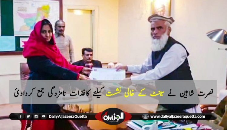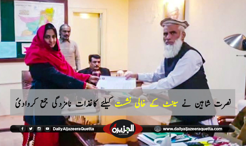 بلوچستان عوامی پارٹی کی خواتین ونگ کے رہنماء نصرت شاہین نے پی ایم ایل این کے مرحومہ سینٹر کلثوم پروین کی خالی نشست پر بلوچستان عوامی پارٹی کی طرف سے کاغذات جمع کروائے ـ