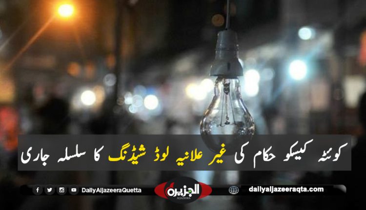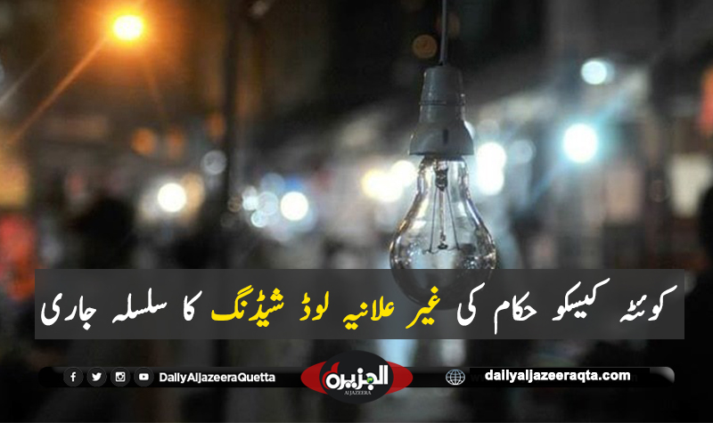 کوئٹہ کیسکو حکام کی غیر علانیہ لوڈ شیڈنگ کا سلسلہ جاری جناح کالونی رئیسانی روڈ میں گزشتہ ایک دن سے بجلی غائب کوئٹہ کیسکو نے کرانی فیڈر کے علاقوں میں 24 گھنٹوں بعد بھی بجلی فراہم نہیں کی کوئٹہ بجلی کی بندش کے باعث جناح کالونی سبزل روڈ ۔قمبرانی روڈ اور گردونواح دو روز سے تاریکی میں ڈوبے ہوئے ہیں کوئٹہ کیسکو کمپلین کا نمبر معروف رکھ دیا گیا